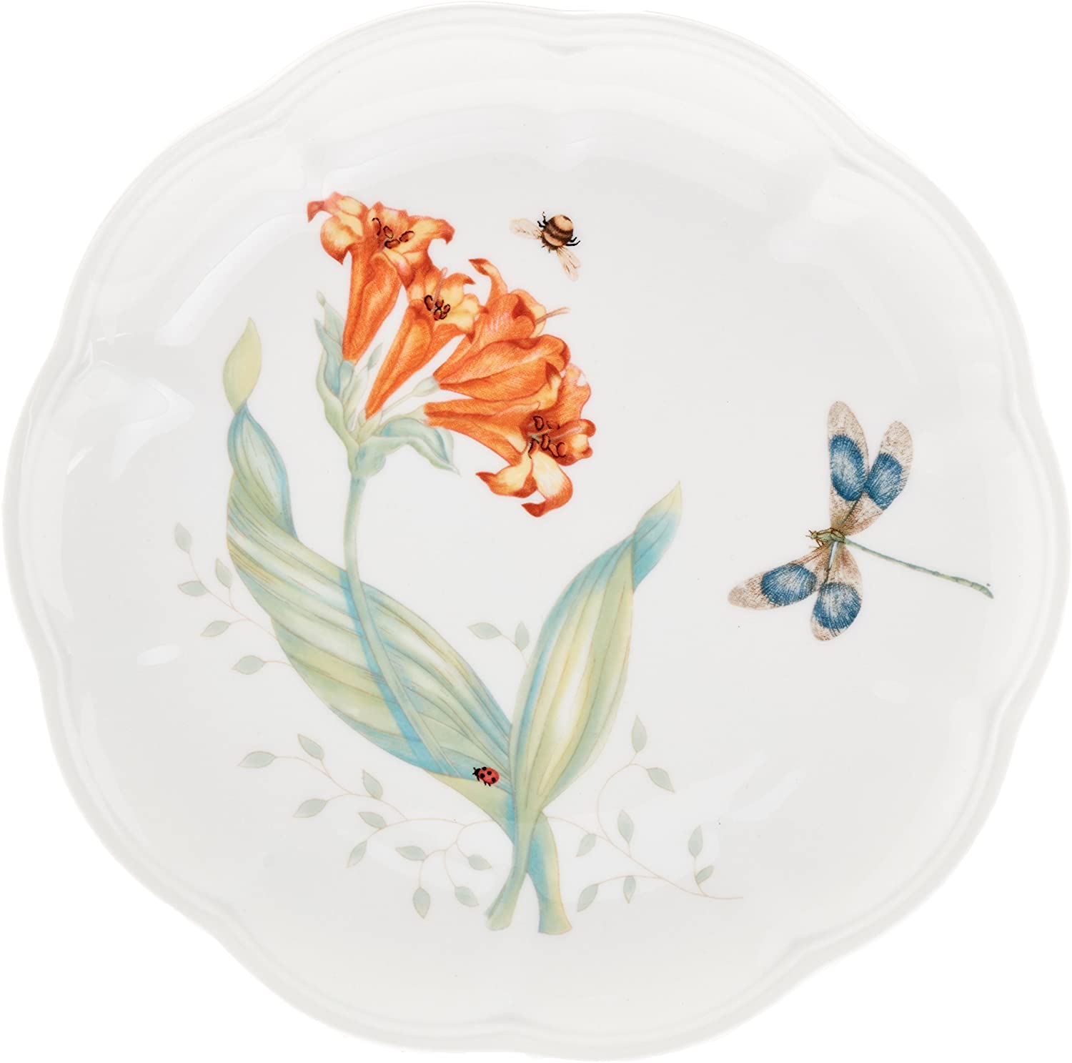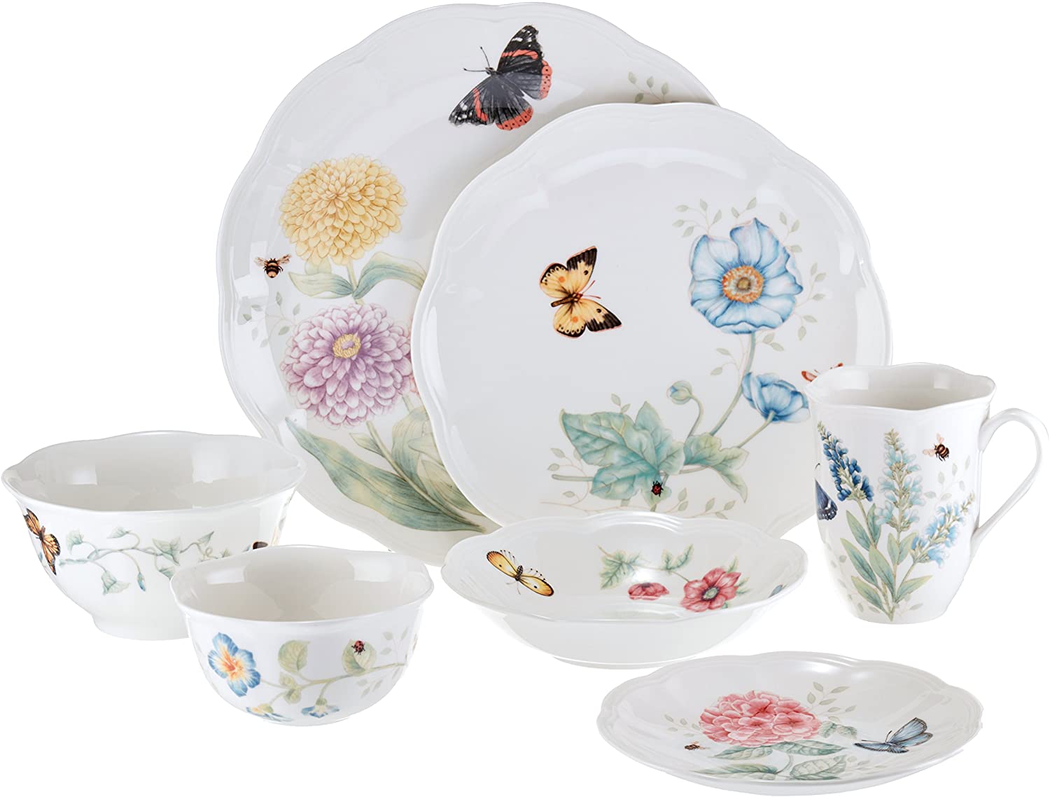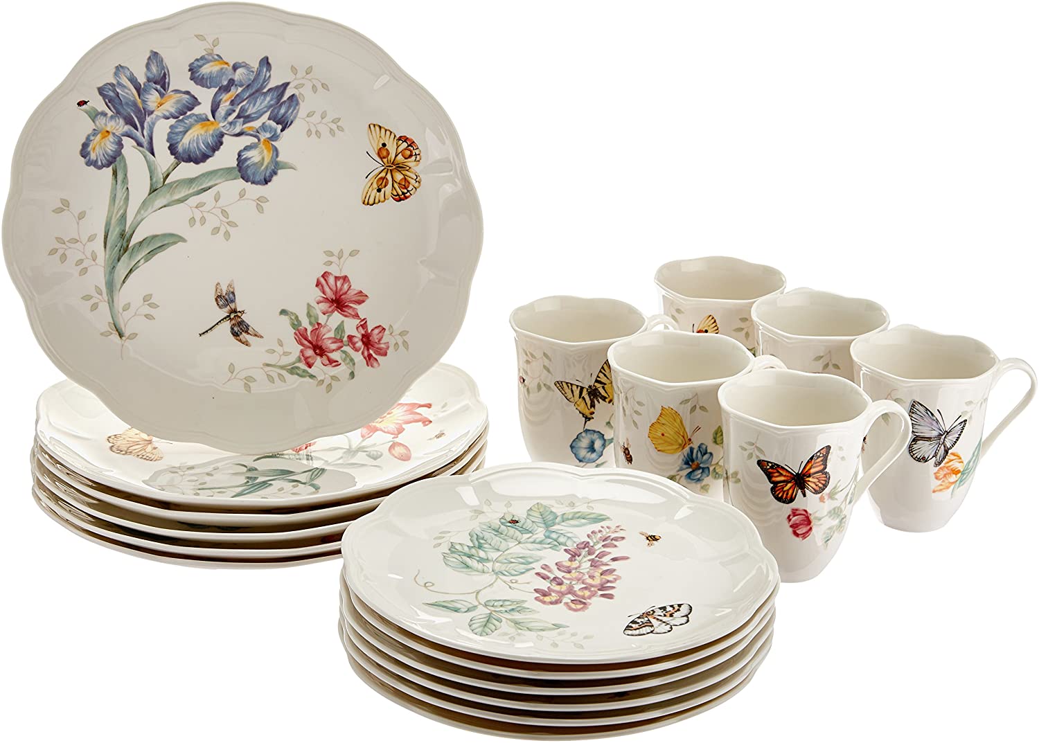 - Florals and butterflies rendered in exquisite colors adorn each scalloped piece