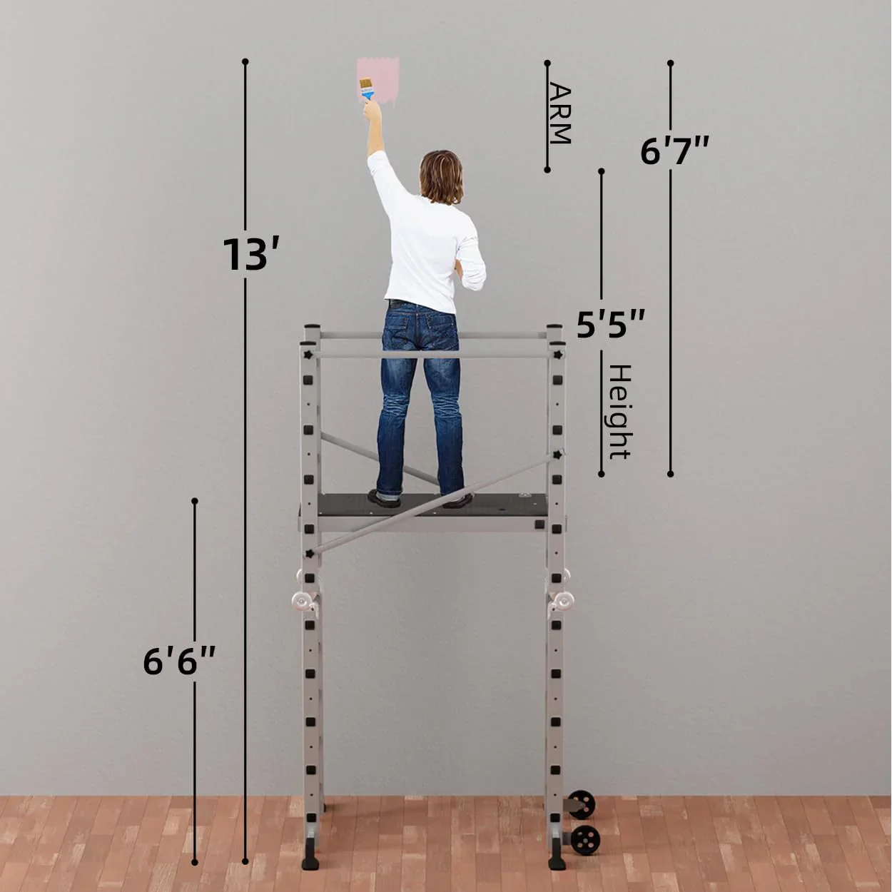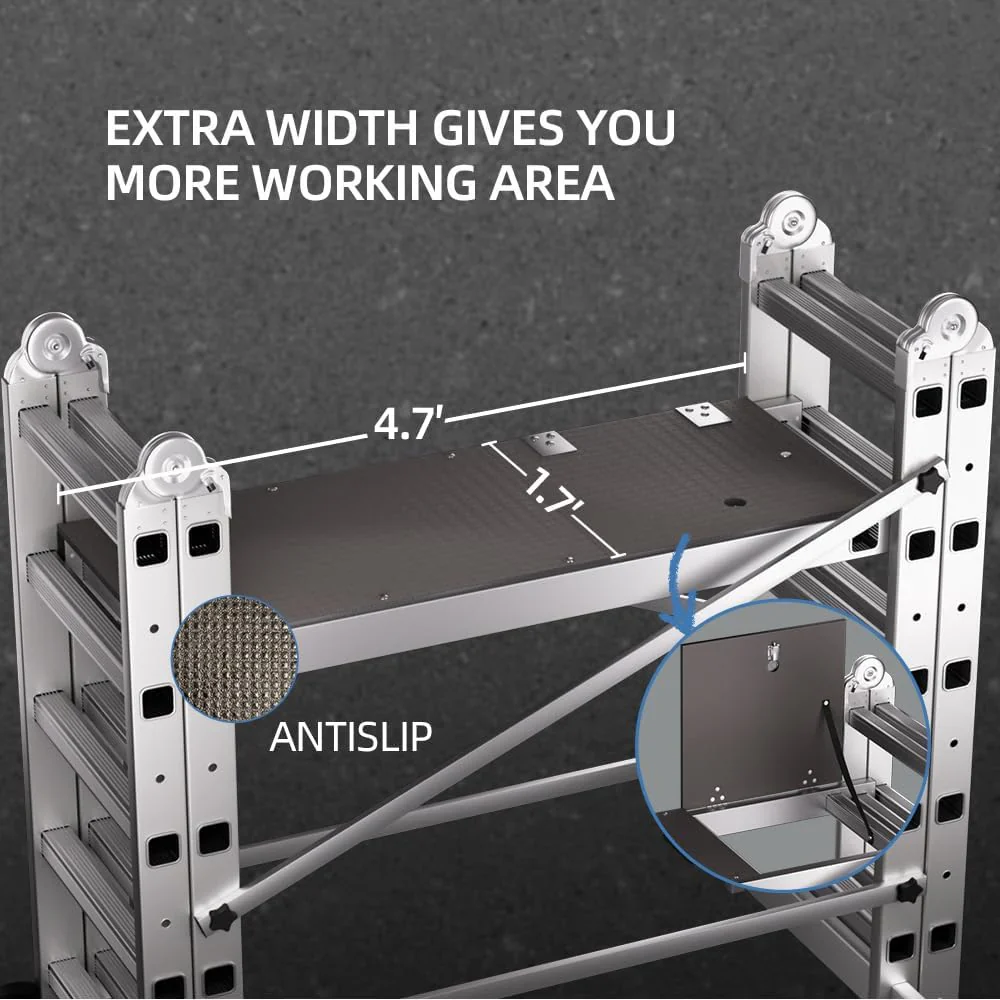 Ideal for painting ceilings and walls, changing light fixtures, cleaning gutters, installing shelves, pruning trees, or any task that requires safe, elevated access. The foldable scaffolding ladder eliminates the need to own multiple ladders and platforms, giving you maximum flexibility in minimal space.
