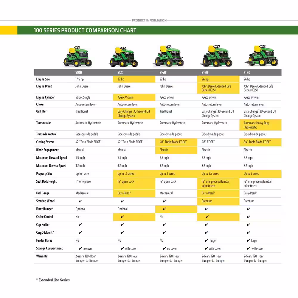 Whether you’re mowing, mulching, or bagging, the S100 offers the performance and durability John Deere is known for. It’s perfect for suburban yards, flat to gently sloped properties, and everyday lawn care.