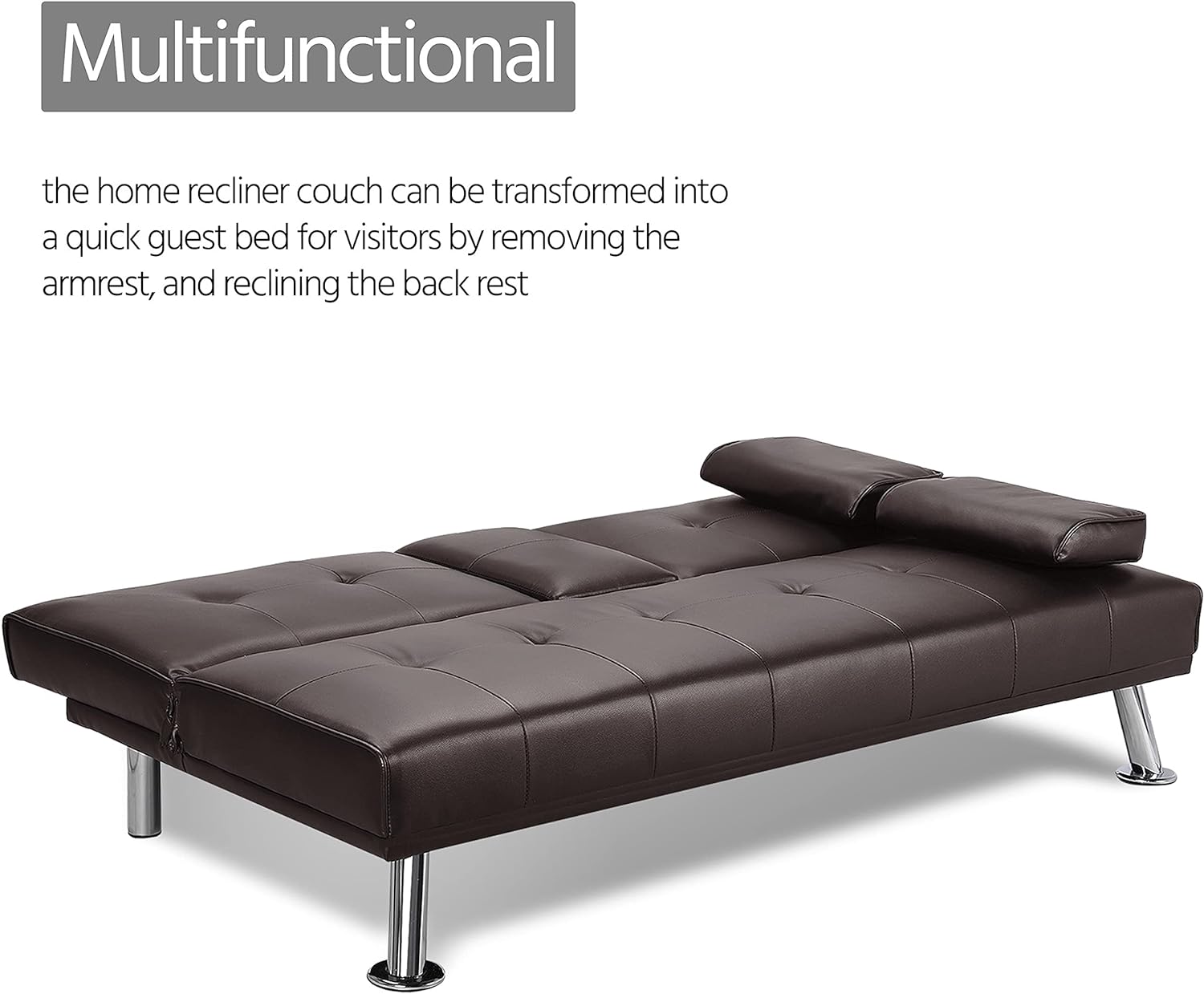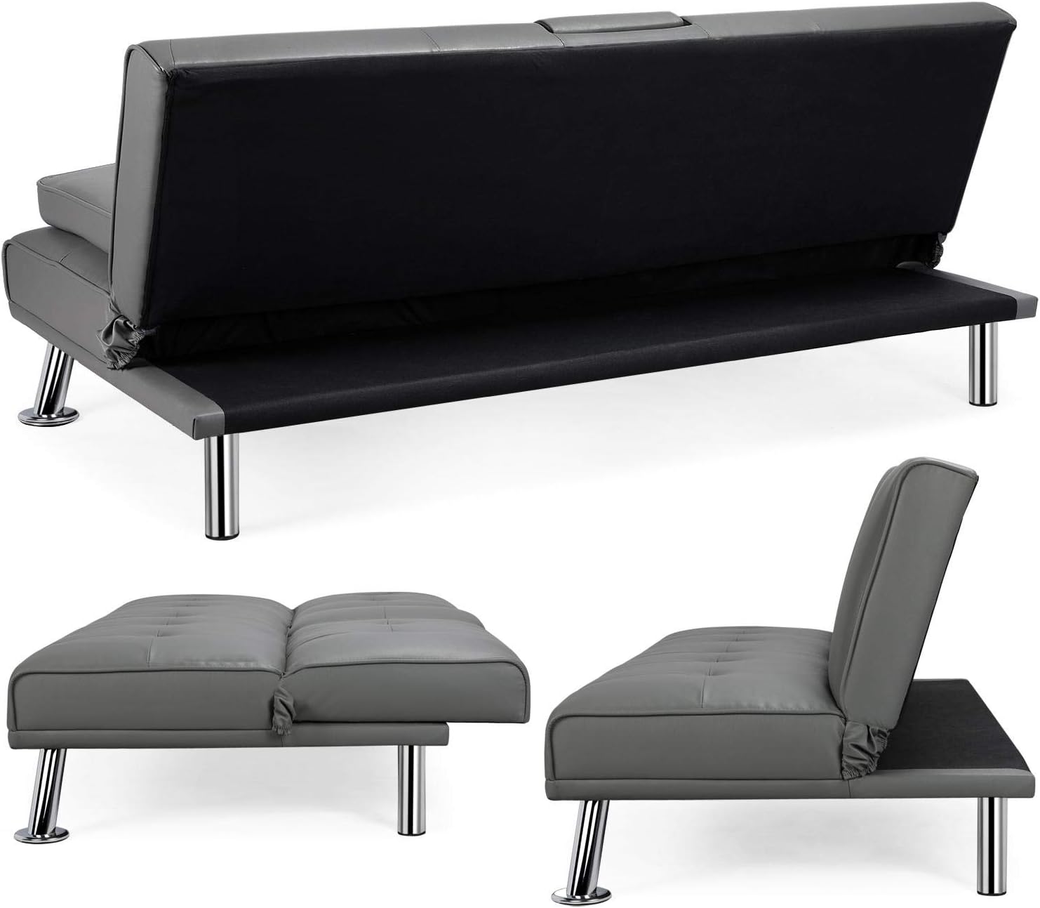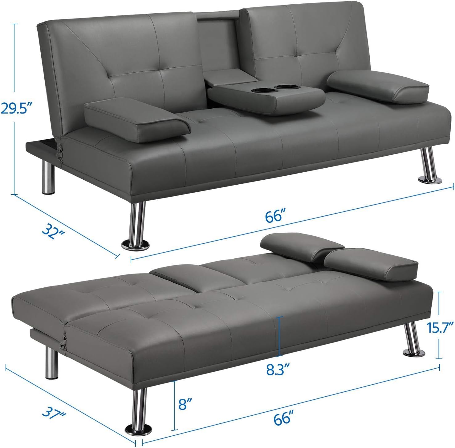 - 【THOUGHTFUL DESIGN】: The leather sofa bed is well designed for entertainment. The middle armrest folds down with 2 cup holders, so you and your friend can relax and enjoy a couple of beverages.
