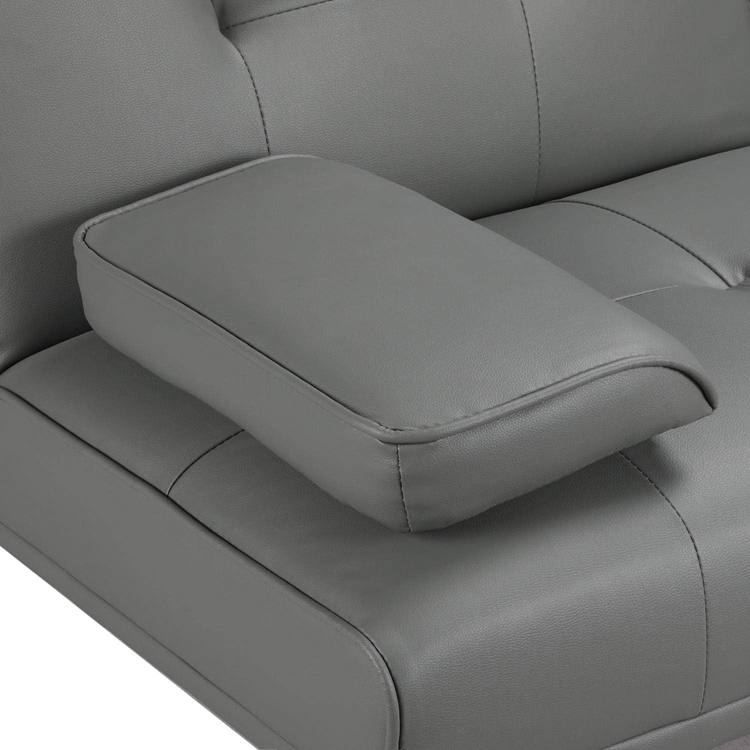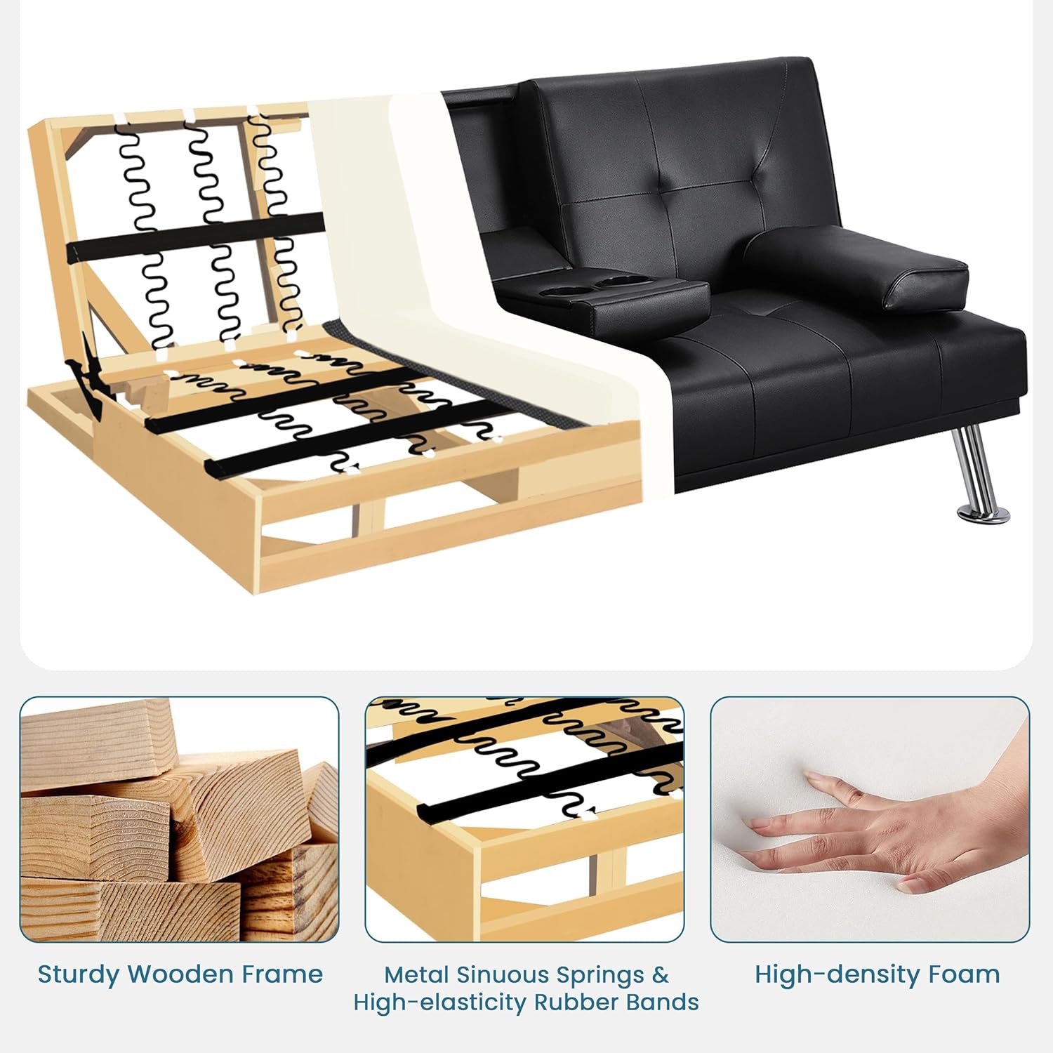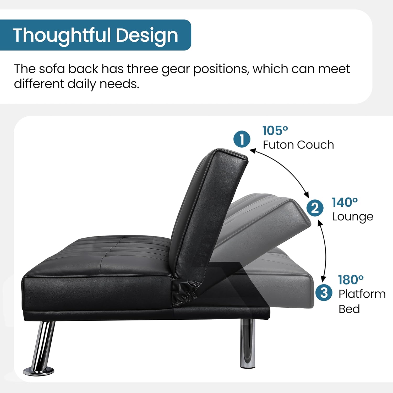 - 【THOUGHTFUL DESIGN】: The leather sofa bed is well designed for entertainment. The middle armrest folds down with 2 cup holders, so you and your friend can relax and enjoy a couple of beverages.